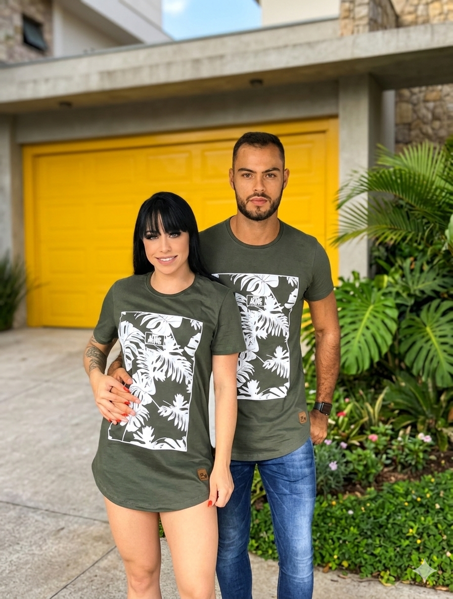 Uma camisa no algodão fio 30 penteado, estampa em alto relevo, logo personalidada, pegando duas ideal para casais.